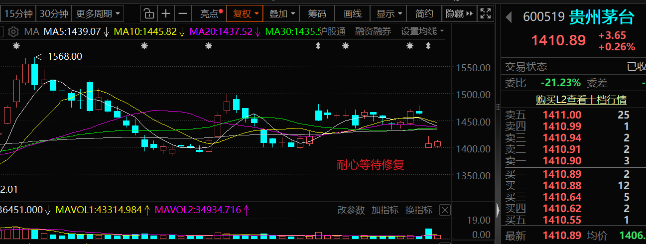 兄弟姐妹们早上好!我是南山。中长线篇我继续省略大盘内容直接聊三只标的实时情况。 (本帖子仅南山个人实盘记录,不构成任何投资建议) $贵州茅台(SH600519)$ 茅台昨天小幅收涨0.26%,收盘落在1410.89元,成交比较温和。前期因为去年四季度业绩不太好看,股价跌了一波,现在抛压已经在慢慢释放,这两天开始有点止跌的意思了。其实仔细看,茅台底子没变,品牌号召力、现金流、经销商体系这些硬东西都还...