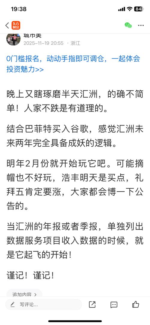 晚上又瞎琢磨半天汇洲,的确不简单!人家不跌是有道理的。 结合巴菲特买入谷歌,感觉汇洲未来两年完全具备成妖的逻辑。 明年2月份就开始玩它吧。可能摘帽也不好玩,浩丰明天是买点,礼拜五肯定要涨,大家都会博一下公告的。 当汇洲的年报或者季报,单独列出数据服务项目收入数据的时候,就是它起飞的开始! 谨记!谨记!