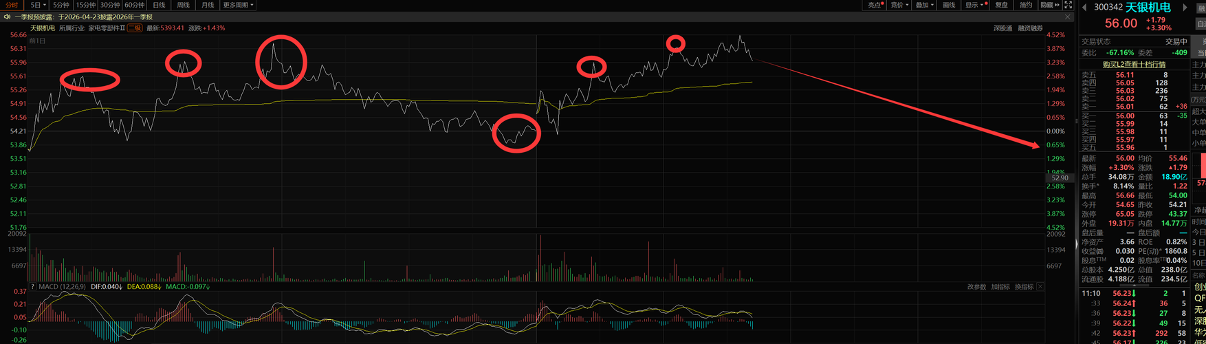 $天银机电(SZ300342)$天天冲高回落,肥鑫人呢