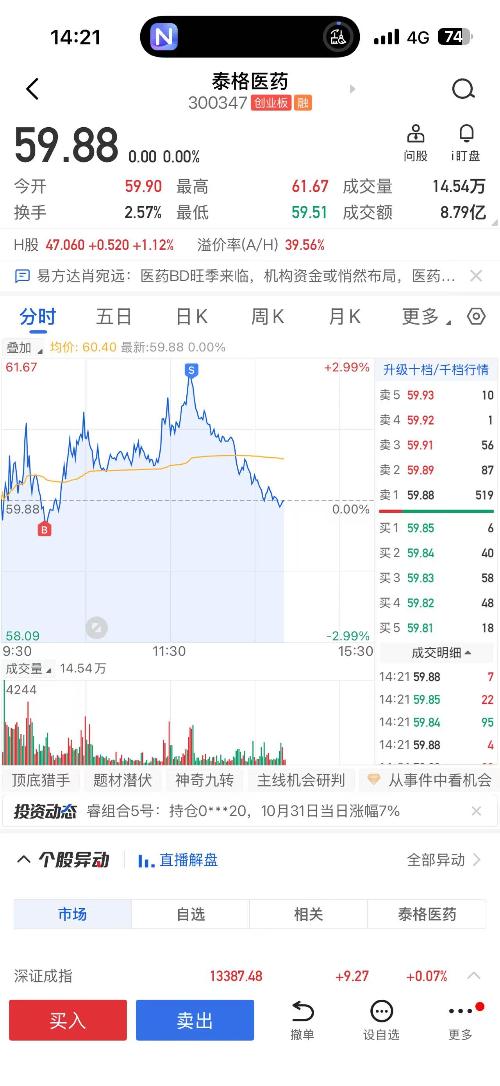 $泰格医药(SZ300347)$医药还是反市场,早盘市场不行就拉的不错,下午市场起来了又开始下去了