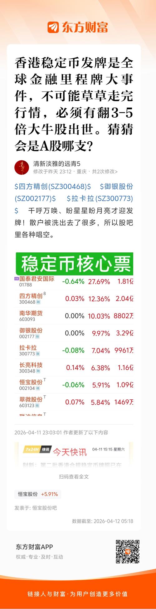 重点来啦~香港首批稳定币牌照落地,汇丰和碇点金融从36家机构中突围!汇丰下半年推港元稳定币,碇点由渣打、香港电讯、安拟集团合资,二季度起发行HKDAP。A股关联标的有掌趣科技(持股安拟)、四方精创(技术服务商)、海联金汇(跨境支付),传统金融+Web3融合的标杆案例哦~