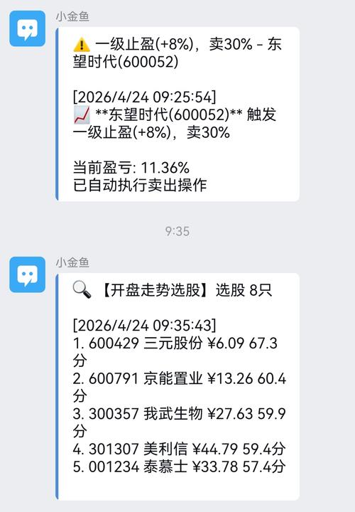 今天真的很搞笑 因为错误卖出晶科科技和长信科技小金鱼更改了止盈策略,今天开盘9:25他4.9挂了东望时代,系统提示委托成功,然后他就美滋滋的等着收红包,没想到其实是没有成交,他就傻傻的等着数钱