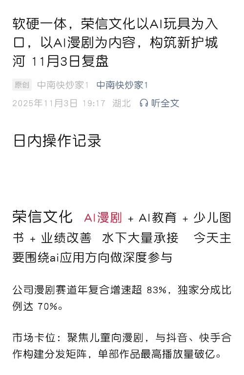 $荣信文化(SZ301231)$AI漫剧+AI教育+少儿图书+业绩改善水下大量承接今天主要围绕ai应用方向做深度参与公司漫剧赛道年复合增速超83%,独家分成比例达70%。市场卡位:聚焦儿童向漫剧,与抖音、快手合作构建分发矩阵,单部作品最高播放量破亿。 $福石控股(SZ300071)$数字营销+AIGC平台+AI应用 ai应用核心人气,今天盘中重新接回来,明天AI漫剧所代表的文化传媒有回流预期 st...