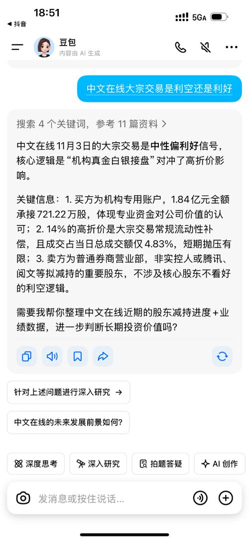 资讯 大宗交易:机构账户买入中文在线1.84亿元(11-03)
