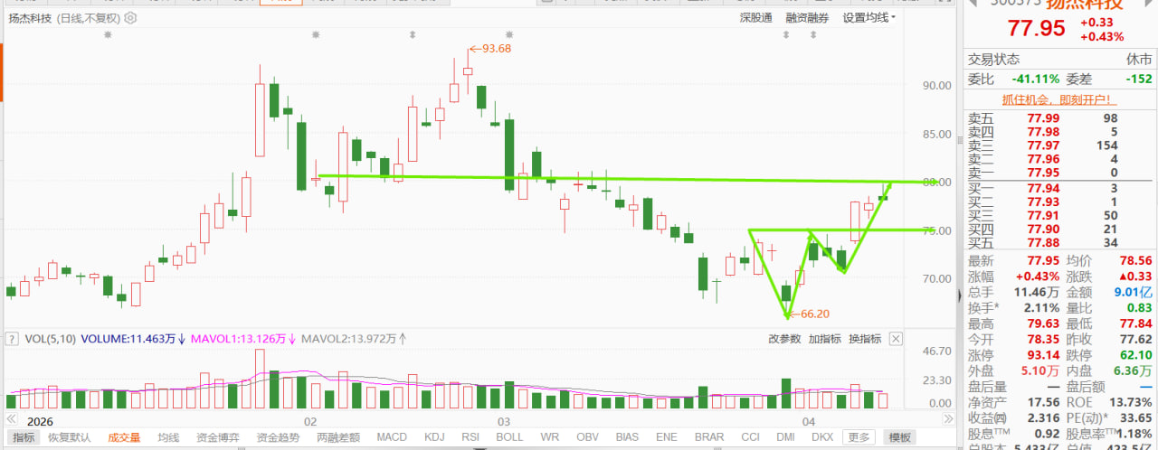 $扬杰科技(SZ300373)$成交量缩成这样,也是厉害了