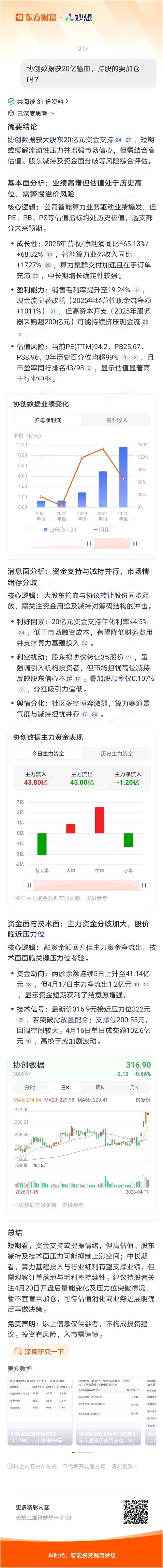 $协创数据(SZ300857)$$算力概念(BK1134)$$光环新网(SZ300383)$截至2026年4月18日,协创数据近期一系列操作整体以重大利好为主,夹杂少量中性/偏空细节,短期股价已充分反映利好,但长期逻辑显著强化。 一、核心利好(决定性) 1.Q1业绩预告炸裂(最强利好)-归母净利润:6.5亿~8.5亿元,同比+284%~+402% -单季利润接近2025全年(11.6亿),算力业务...