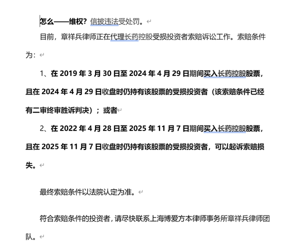 *ST长药索赔登记,公司因信披违规,被强制退市,退市不等于免责,根据相关司法解释,索赔条件暂定如下:凡是在2022年4月28日至2025年11月7日期间买入并在2025年11月7日收盘时仍持有的投资者,均可参加索赔报名(参加索赔请继续翻页)