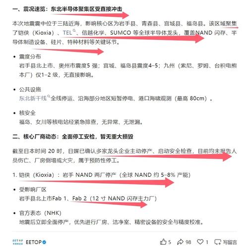 $飞凯材料(SZ300398)$明天20厘米,日本地震确实引发了光刻胶产能中断,对全球高端光刻胶供应造成了显著冲击。核心影响-产能受损企业:信越化学福岛白河工厂、东京应化福岛郡山工厂等位于震区附近的核心产能全面暂停,这些是全球ArF、KrF等中高端光刻胶的关键供应基地。
