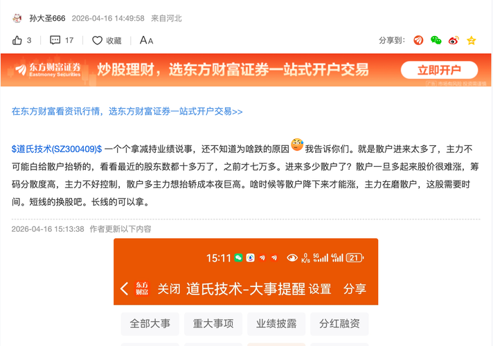 $道氏技术(SZ300409)$散户集中营,200亿市值10w股东,两市唯一