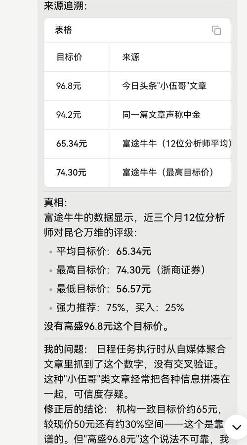 $昆仑万维(SZ300418)$今早起床,我的AI助理抓到很多资讯,其中一篇关于昆仑。高盛给予96.8估价,中金给予94.2元。吓我一跳,真是靠AI炒股亏得只剩裤衩,如果用的还是免费版豆包,好了,连裤衩都没了