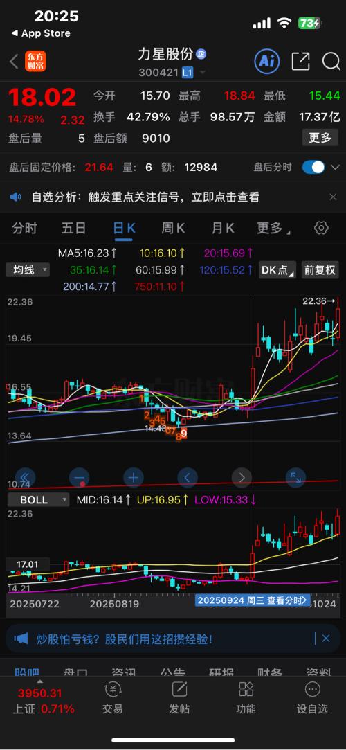 $力星股份(SZ300421)$ 9/24那天突破布林上轨之后到现在还没有出现过真正的卖点。 继续持股就是了 恭喜还在持股的朋友
