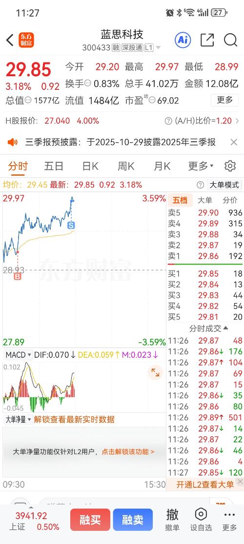 $蓝思科技(SZ300433)$2.5个点的差价,我觉得不少了,毕竟每天都可以这样干。谢谢主力!谢谢蓝思科技!谢谢昨日回贴骂我的韭菜!谢谢不作为的周群飞董事长!要谢的人太多了,祝大家好运! 每天一问:回购啥时候完成啊?