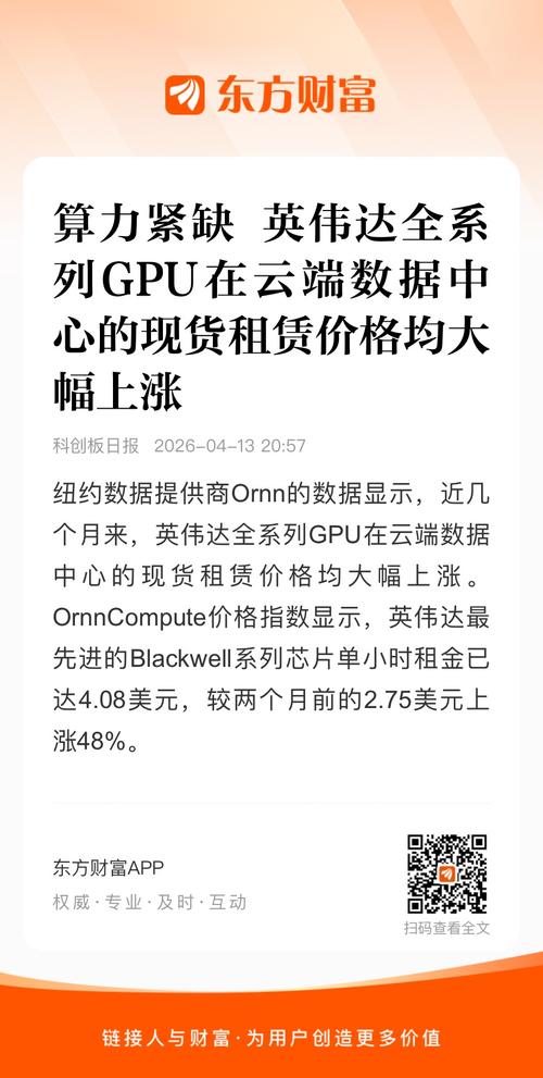 $润泽科技(SZ300442)$格隆汇4月13日丨纽约数据提供商Ornn的数据显示,近几个月来,英伟达全系列GPU在云端数据中心的现货租赁价格均大幅上涨。OrnnCompute价格指数显示,英伟达最先进的Blackwell系列芯片单小时租金已达4.08美元,较两个月前的2.75美元上涨48%。