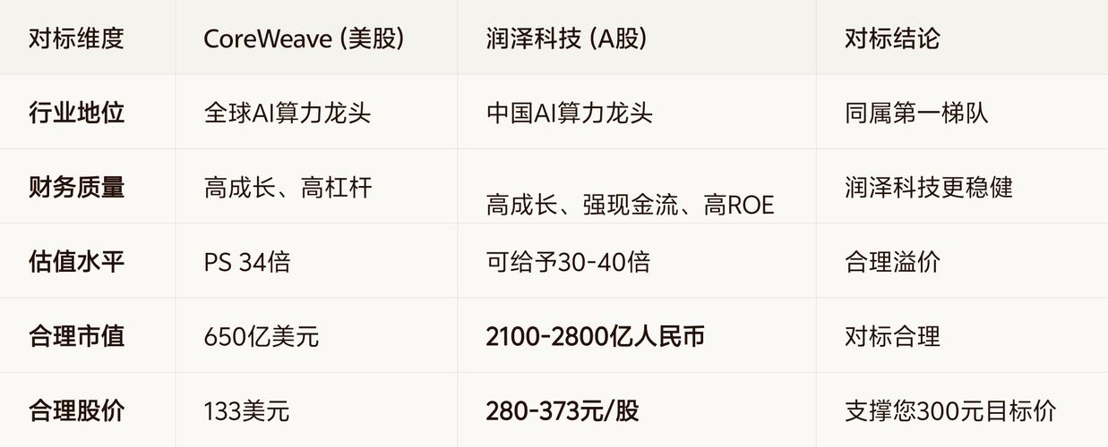$利通电子(SH603629)$ 一、对标基准:润泽科技(当前4.15) -市值:1420亿 -算力:3万P -单P市值:1420亿÷3万P≈473万元/P -2026扣非净利:33亿(机构一致) -PE(扣非):1420÷33≈43倍 二、利通电子对标润泽(同P数估值) -利通算力:3.3万P(>润泽) -按润泽单P473万/P算: 合理市值=3.3万P×473万/P≈1560亿 -现价市值:2...