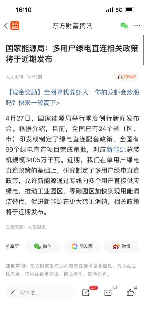 $双杰电气(SZ300444)$ 国家能源局:多用户绿电直连相关政策将于近期发布 人民财讯1小时前约58秒4月27日,国家能源局举行季度例行新闻发布会。根据介绍,目前,全国已有24个省(区、市)印发或制定了绿电直连配套政策,全国有99个绿电直连项目完成审批,对应新能源总装机规模3405万千瓦。近期,我们在单用户绿电直连政策的基础上,研究制定了多用户绿电直连政策,允许新能源通过专线向多个用户直接供应...