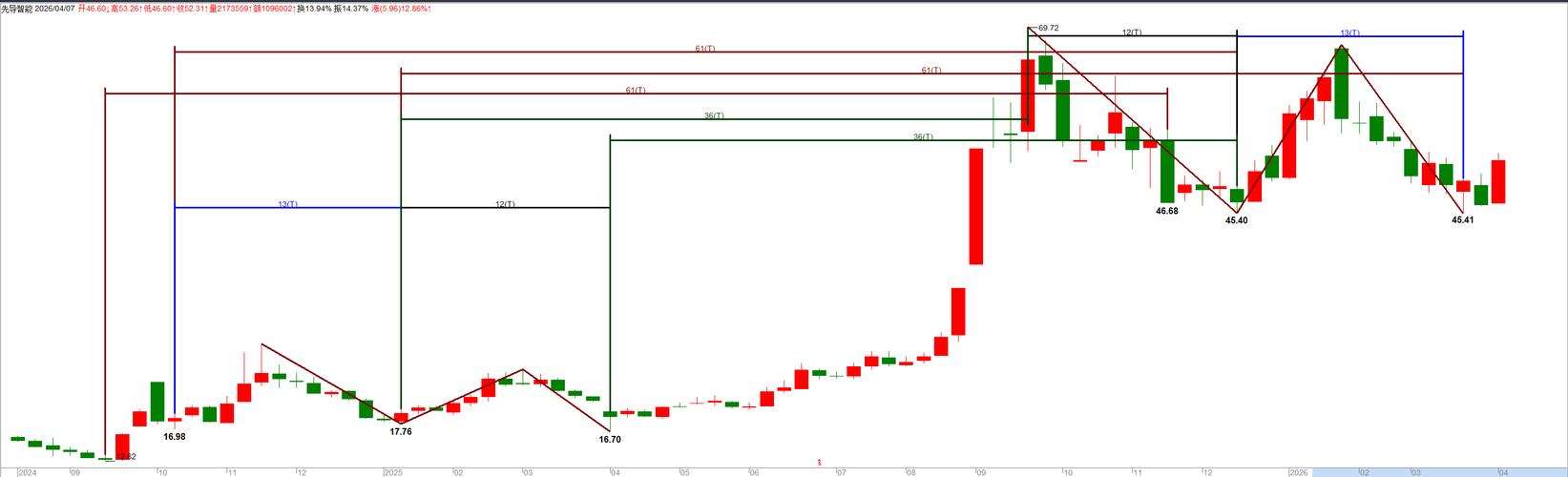 $先导智能(SZ300450)$左面列出四个低点:最低点12.82,三个次低点16.98,17.76,16.7与右面最高点69.72,三个次低点46.68,45.40,45.41对应关系: 第一组数据:12.82至46.68低到低跨度62周内含28阴34阳。16.98至45.40低到低跨度62周内含28阴34阳。17.76至45.41低到低跨度62周内含28阴34阳。时间对称阴阳平衡导致本次调整三...
