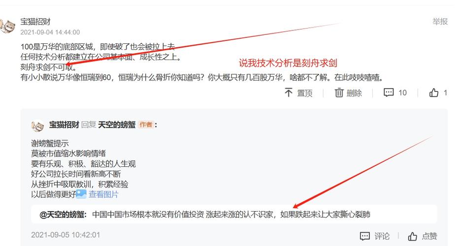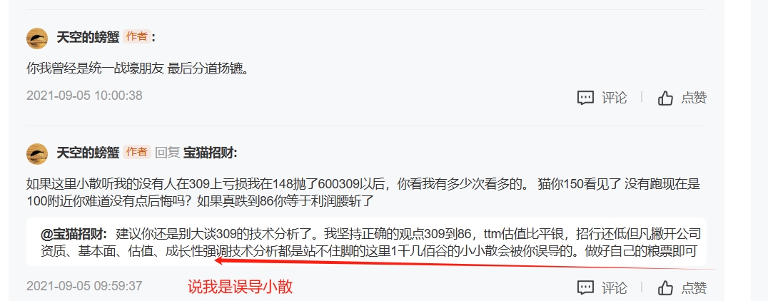 朋友在2021年在600309股票遇到事情,当初螃蟹600309在148跑了,我认为那个就是头了,,今天螃蟹找到当时可能认为自己是股神人物了,高举价值投资旗子 他发的账号收益是牛逼,他最高有700%,当时600309在104附近,已经跌了40% 说我的技术是刻舟求剑 说我是误导小散,技术分析是站不住脚的,最后600309从149跌到了52, 大家想想他最高赚了有700%,怎么样可能相信我的技术,终...