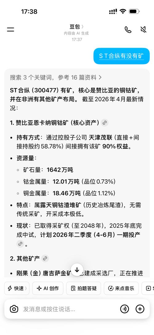 $ST合纵(SZ300477)$说st合纵没有矿的仔细看看2018年st合纵的矿产资源公告,明确公司拥有铜矿18万吨!钴矿12万吨!按照最新铜钴价格约值680亿元!比st正平的矿还值钱,现在只差一个破产重整公告就可以起飞,680亿矿加锂电行业,想象空间巨大!