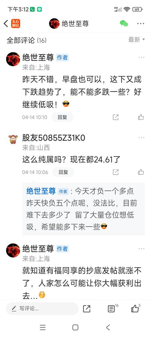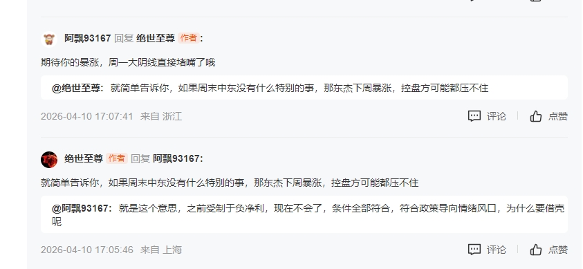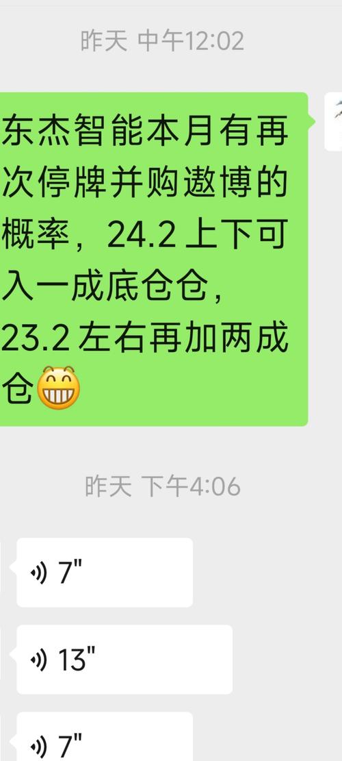 $东杰智能(SZ300486)$这号最后一次连发三次是4月十日中午,大概内容是:能承受住风险的加仓至七成,后来这号有不顺畅,就使用了雨轩186那个号,13日上午雨轩186,10点多点连发三次让早盘低吸的高抛,快11点时连发三次让加仓至七成的考虑逢高要不要降两三成仓位?防止我多转空,所以大多数都已仓位比较轻了,只有极少数非常笃信东杰并购遨博的还重仓,东杰并购遨博一直都只有五成概率,只不过这周多了一点...