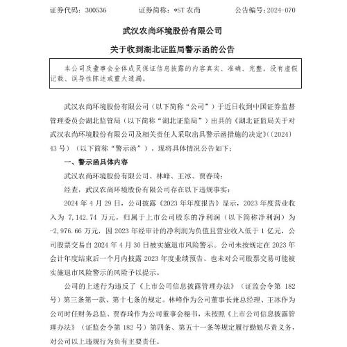 农尚环境适格投资者仍可申请索赔。因违反《上市公司信息披露管理办法》相关规定,公司及相关责任人被采取出具警示函的行政监管措施。公开消息显示,已有一审胜诉,2024年1月31日(含)至2024年4月28日(含)期间买入且之后卖出或仍持有的受损投资者,可通过“公义365网”登记申请。