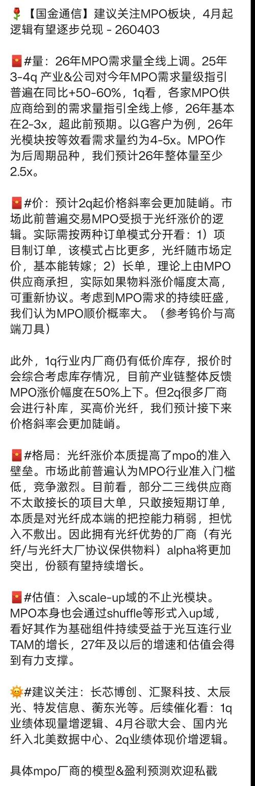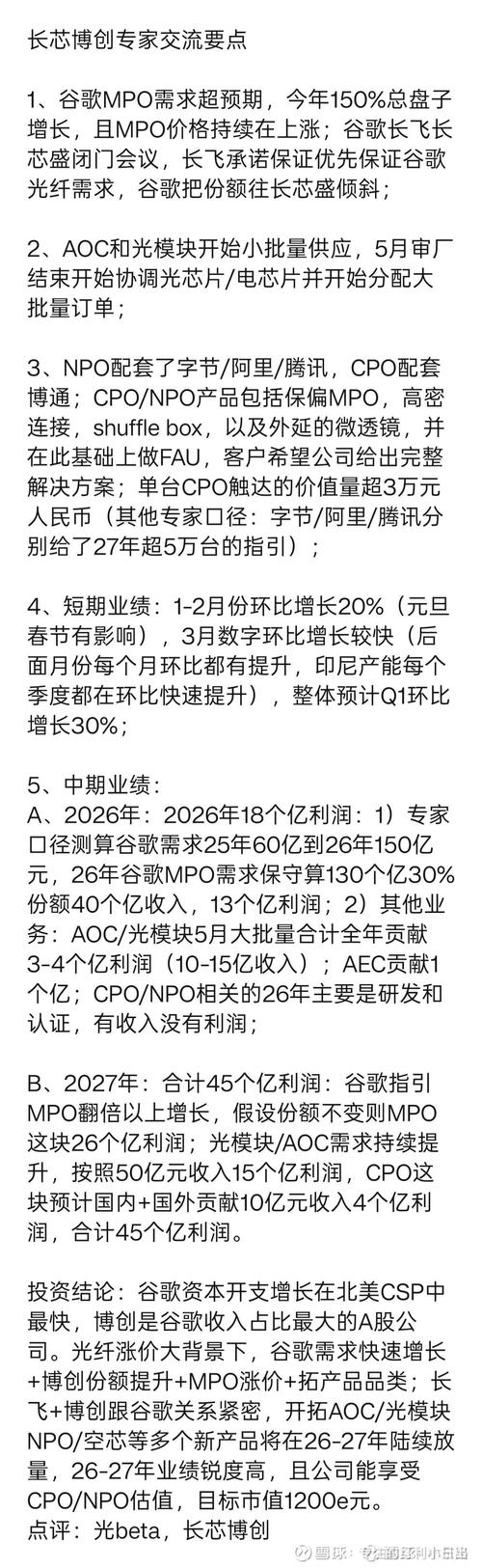 $长芯博创(SZ300548)$ MPO景气度上升,上游核心原材料光纤紧缺、涨价,暴涨。 所以二线三线五线MPO小厂都得倒闭。 远东亨通的光纤目前还进不去北美csp。 以谷歌为例直供MPO的实锤的只有康宁和长芯博创和汇聚。 汇聚是立讯精密子公司,没有自己的光纤光棒,康宁的光纤光棒不够用。所以博创份额会提升得非常吓人。所以有mpo产能的四川光恒托管给博创了,所以收购了有技术又有mpo产能的鸿辉光联。...