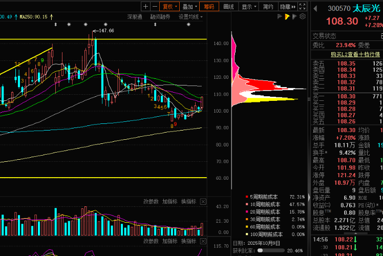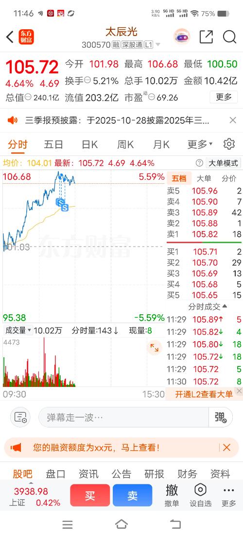$太辰光(SZ300570)$ 46W开启记录复盘日记,第108天 持仓:300698万马科技300570太辰光 300328宜安科技 卖出:300693盛弘股份 太辰光目前受益于全球AI算力投资的热潮,扎实的业绩加上精准的产能扩张,与行业巨头英伟达的深度绑定,构成了其股价的强力支撑。股价处于高位震荡区间,跌破100支撑位,可能下探96附近;如果站稳108元压力位,将开启新一轮上涨