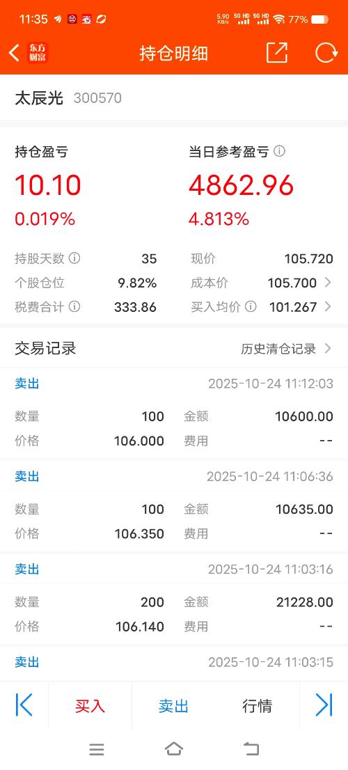 $太辰光(SZ300570)$十多万谨慎减仓大半,接下来就希望它回落,明天再跌下来,各位莫怪哈,我好做T加仓。持仓一个多月,现在刚回本