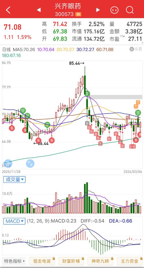 $兴齐眼药(SZ300573)$全散户,连创业板指数都跑不过,早上就到了68.42,结果又打到67.27,比昨天的67.34还低。一天可以作两个差价。