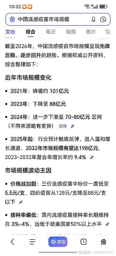 $康泰生物(SZ300601)$ $康泰生物(SZ300601)$从康泰三价流感MDCK细胞开启1期临床,谈康泰流感疫苗布局和雄心及市场预期差昨晚康泰三价流感MDCK开启一期临床实验的公告,可能没有引起太多人的关注。市场对康泰布局流感疫苗,可能只认为康泰是一个普通的追随者,毕竟目前的流感疫苗市场竞争已经非常激烈,玩家很多。一、谈一下中国流感疫苗市场规模,见图片1。尽管这两年有一定下滑,但目前仍是接...