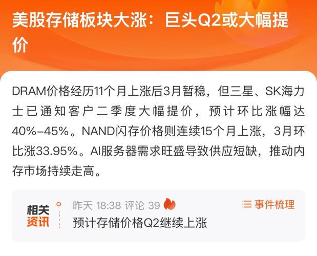 美股存储芯片板块大涨全解析(2026年4月最新) 一、核心催化:巨头官宣Q2大幅提价,行业景气度彻底引爆 你截图里的消息正是本轮大涨的直接导火索: -DRAM:经历11个月连涨后3月暂稳,但三星、SK海力士已正式通知客户,二季度DRAM价格环比大涨40%-45%,部分机构预测实际涨幅可达58%-63%; -NAND闪存:连续15个月上涨,3月单月环比涨幅就达33.95%,Q2预计继续涨70%-75...