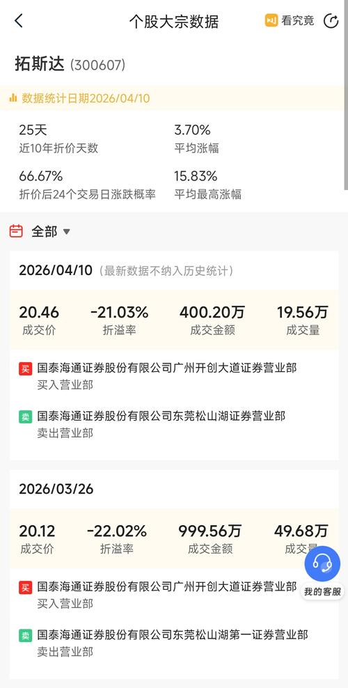 $拓斯达(SZ300607)$ 最新大宗交易(2026-04-10) •成交价格:20.46元 •当日收盘价:25.91元 •折价率:-21.03%(大幅折价) •成交量:19.56万股 •成交金额:400.2万元 •买方:国泰海通证券广州开创大道营业部 •卖方:国泰海通证券东莞松山湖营业部 近期大宗交易(近3个月) 1.2026-04-10:19.56万股,折价21.03% 2.2026-03-...
