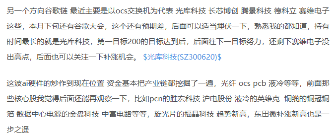 东篱玩投资修改于昨天15:13·来自Android OCS概念主要标的分级梳理 一、核心前提 OCS赛道:整体价值目前占算力总开支1%左右,规模小、壁垒高、格局集中;仅高端大模型训练集群刚需,英伟达确定入局会加快产业发展。 二、梯队+核心看点+催化 T0高确定性(龙头锁单、壁垒垄断) 1.赛微电子 -看点:Silex独家代工谷歌MEMS微镜,全球垄断,毛利近90% -催化:谷歌扩容、订单延续至20...