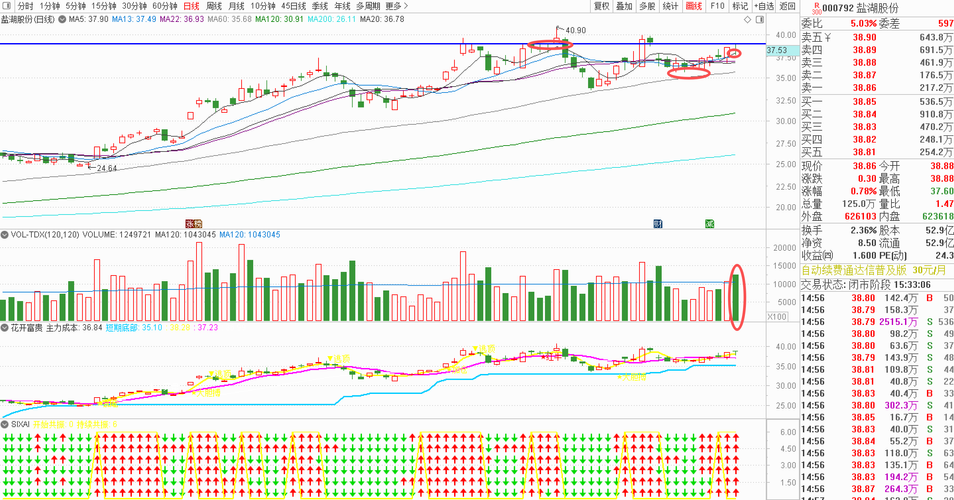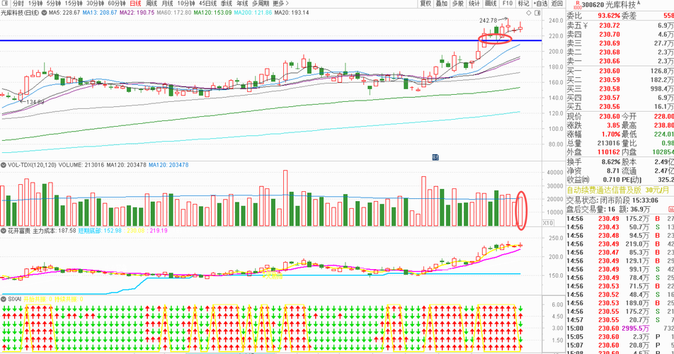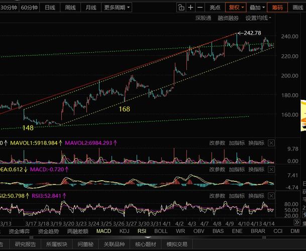 主力今日流入3.37亿,高位流入3.7亿后,股价达到高位238.8呈现震荡出货。228高开拉升至231,极速压低至224位置开始吸筹,之前判断新底在214附近,短线支撑位判定在224,主力吸筹224-227,明日在237附近位置存在很大出货机率,若突破前高242.78回调机率增大,股价继续突破的可能在二季报。 以上仅个人操盘观点,不喜勿喷。