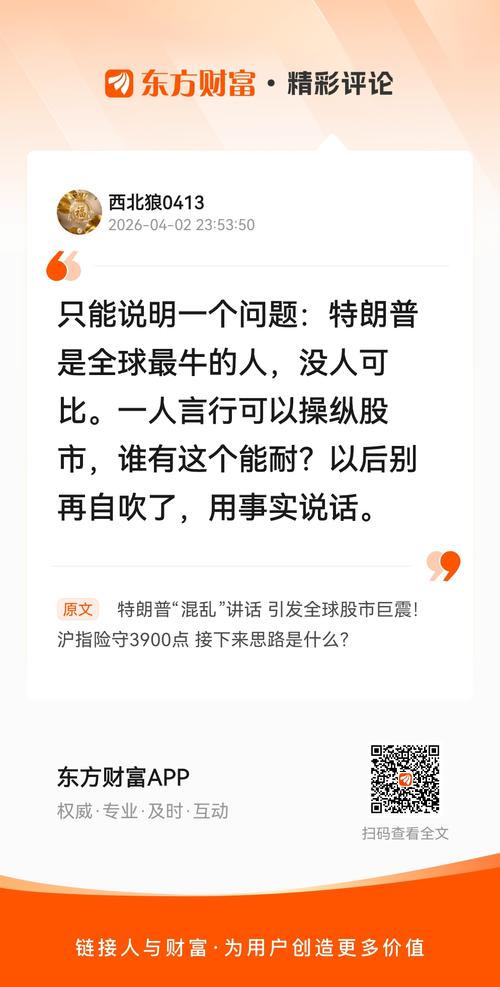 只能说明一个问题:特朗普是全球最牛的人,没人可比。一人言行可以操纵股市,谁有这个能耐?以后别再自吹了,用事实说话。 我在《特朗普“混乱”讲话引发全球股市巨震!沪指险守3900点接下来思路是什么?》的评论获得了大家的关注。