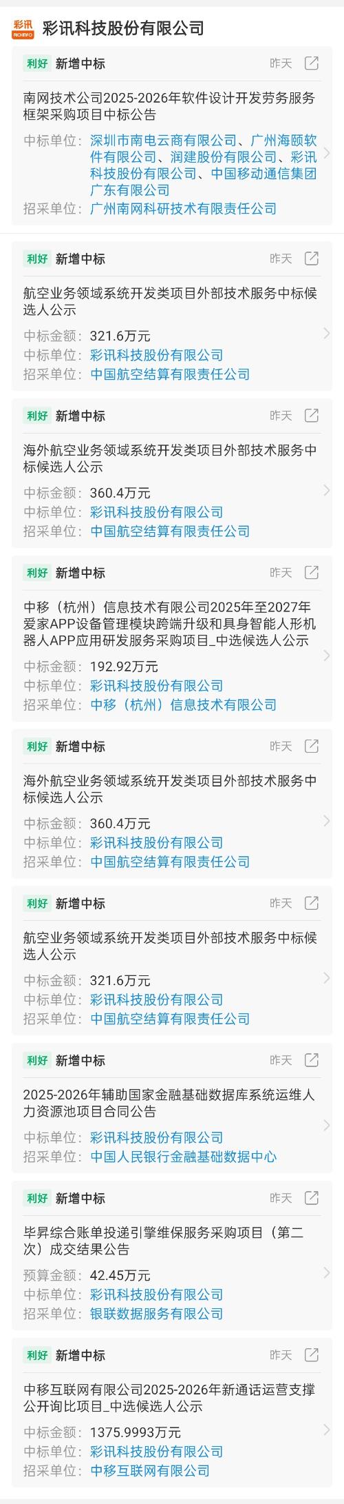 $彩讯股份(SZ300634)$昨天项目中标更新挺多的,中移还是大头。