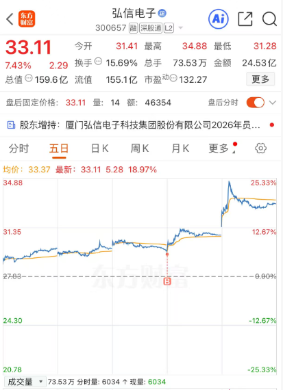 弘信电子(300657.SZ) 2026年4月14日股价上涨7.43%,明盘主力资金净流出1.073亿元,暗盘主力资金净流入1.89亿,结合盘后发的员工增持公告来看,早盘的拉升是增持资金介入推动的,而这个老弱装没有一点格局才20%多的涨幅就急不可待的出货一整天。以下综合分析: 一、股价上涨情况 1.当日涨幅股价上涨7.43%,最新价33.11元,5日累计涨幅18.97%,显示短期强势。 2.市场背...