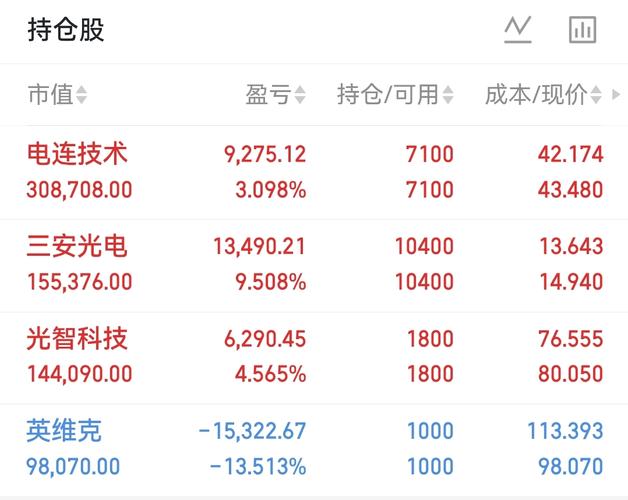 $三安光电(SH600703)$昨天开盘介入的,也是拿了个板了,看情况再操作了 $电连技术(SZ300679)$拿了也有几天了,有盈利看大盘怎么样,随时撤退 $光智科技(SZ300489)$虽然吃了几个点,再拿一天看看行情 英维克挨打要立正