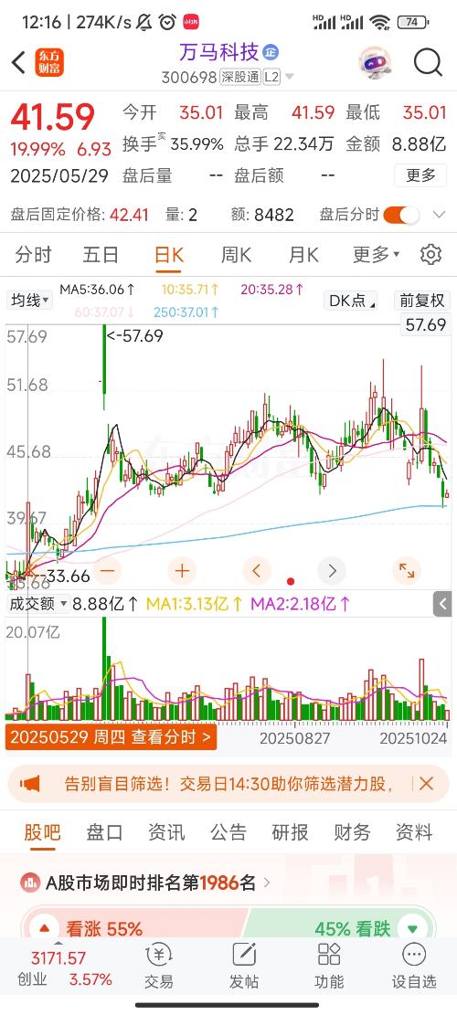 $万马科技(SZ300698)$自5.29涨停到41.59以来,上周五是成交量最低的。回到起涨点且是箱体下沿。地量见地价。周末出的业绩还是不错的,而且要到年底了,生肖概念一般11月启动。看涨