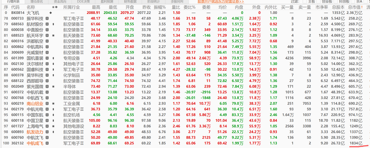 看来今天是一季报和增发完成前最后的黄金坑了,很多人拿不住了,东财大飞机概念100支股票,市值从28亿到1834亿,安达维尔目前市值排倒数第4,作为根红苗正的大飞机一级供应商,中长线淡定持股,今年目标80亿以上!