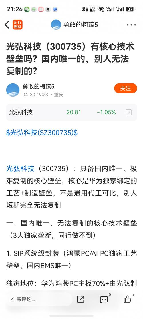 $光弘科技(SZ300735)$ 光弘科技(300735):具备国内唯一、极难复制的核心壁垒,核心是华为独家绑定的工艺+制造壁垒,不是通用代工可比,别人短期完全无法复制 一、国内唯一、无法复制的核心技术壁垒(3大独家垄断,同行做不到) 1.SiP系统级封装(鸿蒙PC/AIPC独家工艺壁垒,国内EMS唯一) 独家地位:华为鸿蒙PC主板70%+由光弘制造,国内唯一能将PC主板压缩至0.8mm、集成5G...
