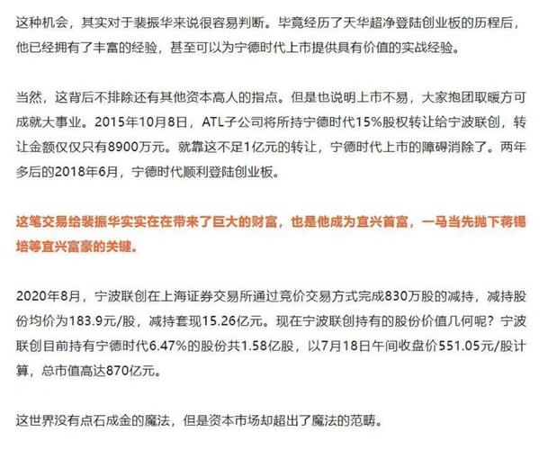 - 宁波联创(裴振华)询价转让股份的原因目的:(1)产业投资部分落袋。人家夫妻2015年花8900万投的宁德,现在鹏满钵满了(2)持股比例从6.23%降到4.96%,今后再在高位减持就不用公告了(3)人家裴振华不缺钱!自己的上市公司天华新能和宁德时代深度绑定,在中游也赚得乐开了花。他套现获得的巨额资金会在与宁德时代合作的平台:宜宾天宜锂业里去购买锂矿资源,进一步巩固天华新能的自给率,提高天华新能的盈利能力。(4)宁德时代同样也受益,他是参股天宜25%,又是天华的第二大股东。他们赚的钱,宁德照样有份额! 综上所述:这就是产业资本在深度绑定后,根据行业周期和盈利趋势做的再一次布局配置,也是大佬们发财致富的智慧。而散户和市场大众眼里的只有那些“减持”“套现”等平庸的视角和思维定式。