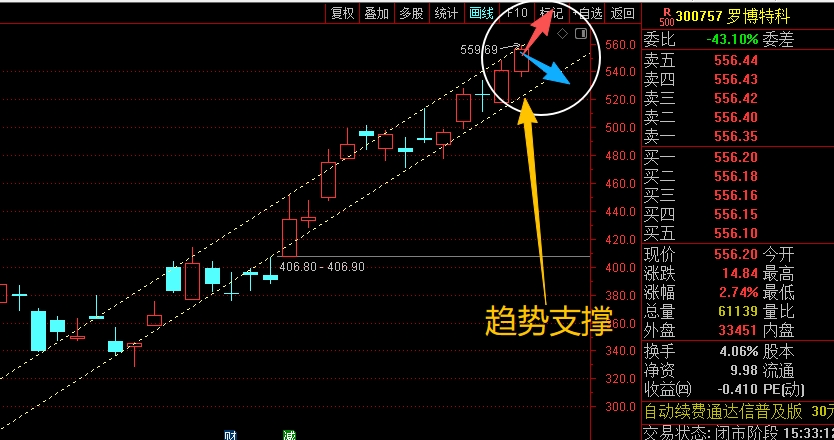 $罗博特科(SZ300757)$中期趋势走得非常强,整体就是拉升横盘再拉升再横盘的反复向上涨的趋势,涨幅非常可观;短期来看,目前正在走一个小的上升通道,接下来重点关注是否能够持续沿着通道震荡上行,能稳住就没问题,持仓等待即可,但如果有效跌破就要注意短线的回落调整风险了,控制好仓位应对,不用纠结。