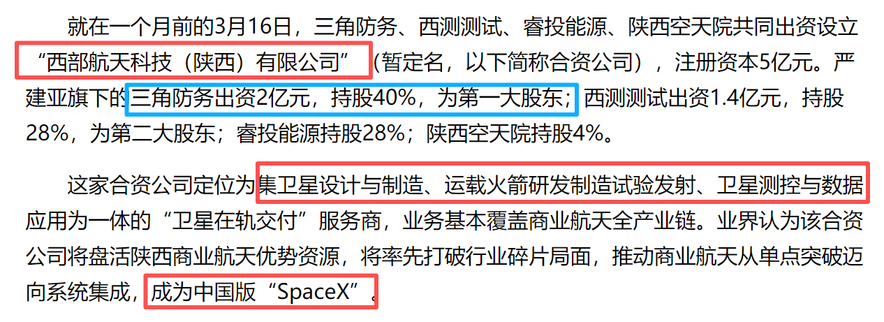 九州云箭至2024年经过多轮融资超五亿,三角防务最近投资入股,持股比例大概百分之十几。