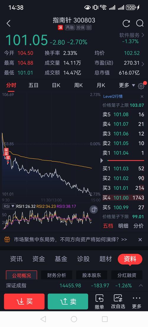 指南针(300803)个股走势全面分析 一、当下盘面核心现状 1.当日分时走势 今天股价全天单边下行,开盘就持续走弱,全程在分时均价线下方运行,尾盘逼近日内最低点101.01,收盘大跌**-2.65%**。 -股价全程弱于均价线,代表日内空头全程占优,资金持续逢高卖出,没有出现有力抄底反弹 -日内波动顺畅下跌,没有抵抗性放量反弹,多头承接力量严重不足 2.日K中期趋势 1.前期从154.33元历史...