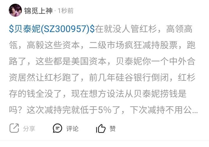$贝泰妮(SZ300957)$$火星人(SZ300894)$你俩低于发行价减持股票是不是股东不负责,这群驴,贝泰妮红杉又跑了,火星人你的海大跑了