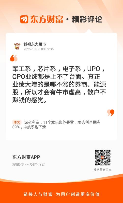 军工系,芯片系,电子系,UPO,CPO业绩都是上不了台面。真正业绩大增的是哪不涨的券商、能源股,所以才会有牛市虚高,散户不赚钱的感觉。