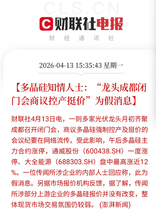 一则多家光伏龙头月初齐聚成都召开闭门会,商议多晶硅强制控产及挺价的会议纪要在网络流传。受此影响,午后多晶硅主力合约涨停,通威股份一度涨停。一位传闻所涉企业的内部人士回应称,此为假消息。另据市场报价机构反馈,据了解,传闻所涉部分上游企业的多晶硅报价并没有改变,整体现货市场交易氛围仍较弱。 #收盘点评##炒股日记#...