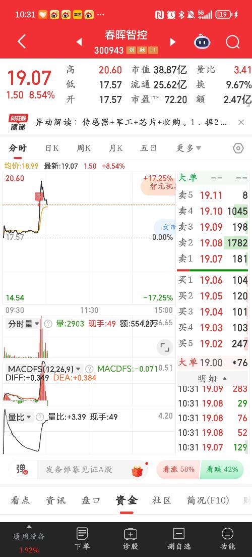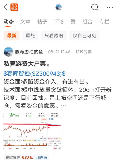 $春晖智控(SZ300943)$18.98数字很吉利啊,