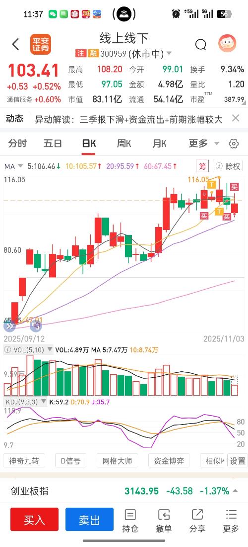 $线上线下(SZ300959)$上周四109.59买2000股,上周五吃大面。今天早上100.04卖1800股。 然后去买了航天智装。 搞来搞去,反而少赚了200块