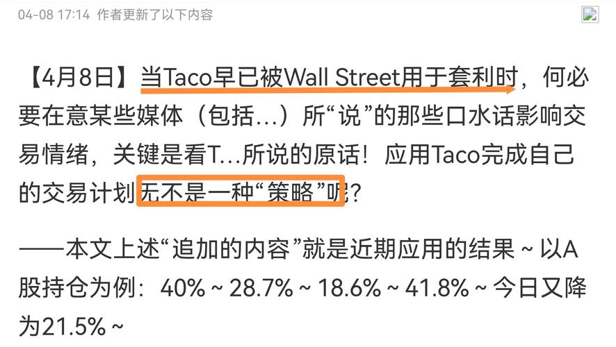 ——4月以来我的交易是在应用Taco来辅助完成的~体现在A股持仓比例短平快的加减上。本周特别是周一“困扰近期大幅波动”的一个现象有些许变化~被大V们称其为“脱敏”~即脱了2月28日以来的那个“敏”。但是,股市是不可能脱敏的:脱了这“军敏”还得依附那“金敏”“税敏”…寻求回归是一种本能。故,Taco的辅助功能一时半会是不会完结的。所以,周一开始我又是短平快“加仓~减仓”的轮回~ ——“静默”一个月后...